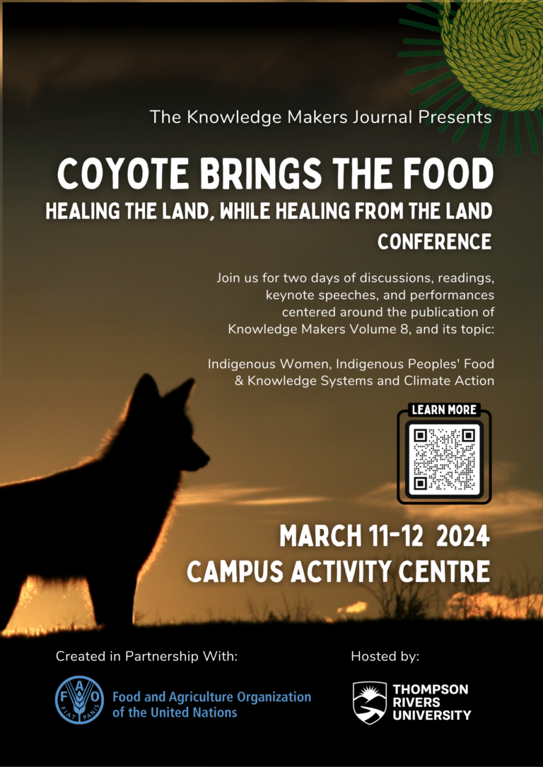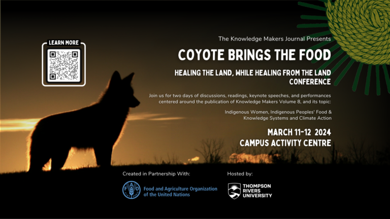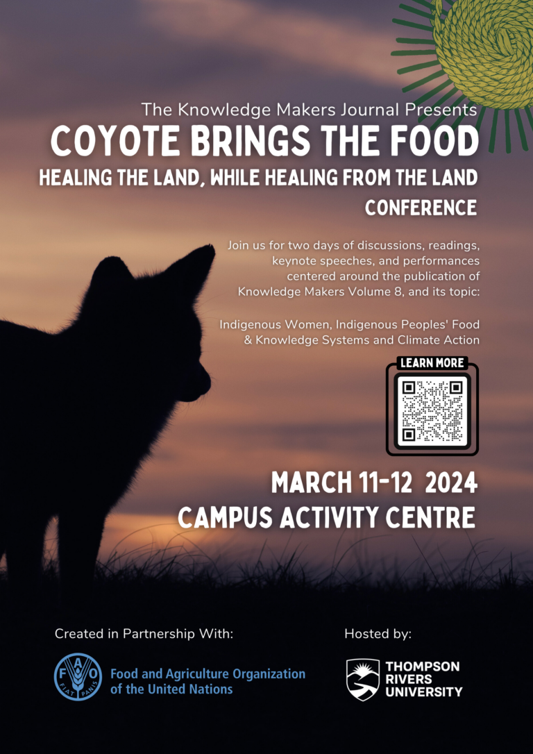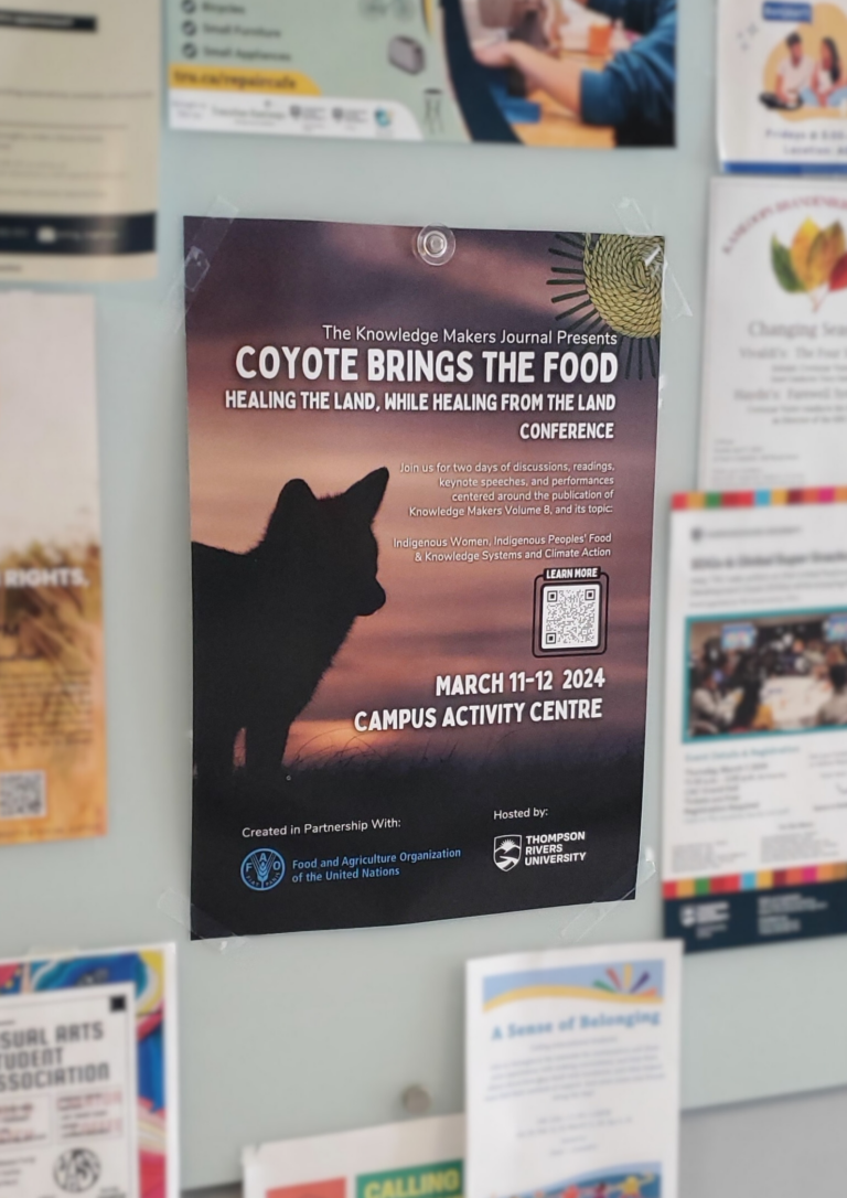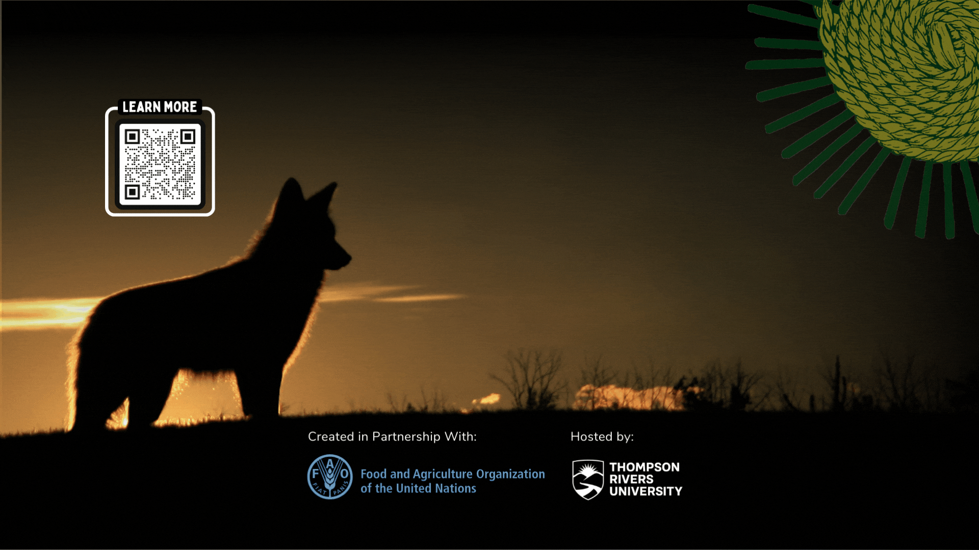 TV images were used on conference center and TRU campus screens, including a the image titled “Main Coyote Brings the Food” on CFJC Midday, after approvals from the Food and Agriculture Organization of the United Nations, TRU MARCOM, TRU World, and the All My Relations Indigenous Research Center.