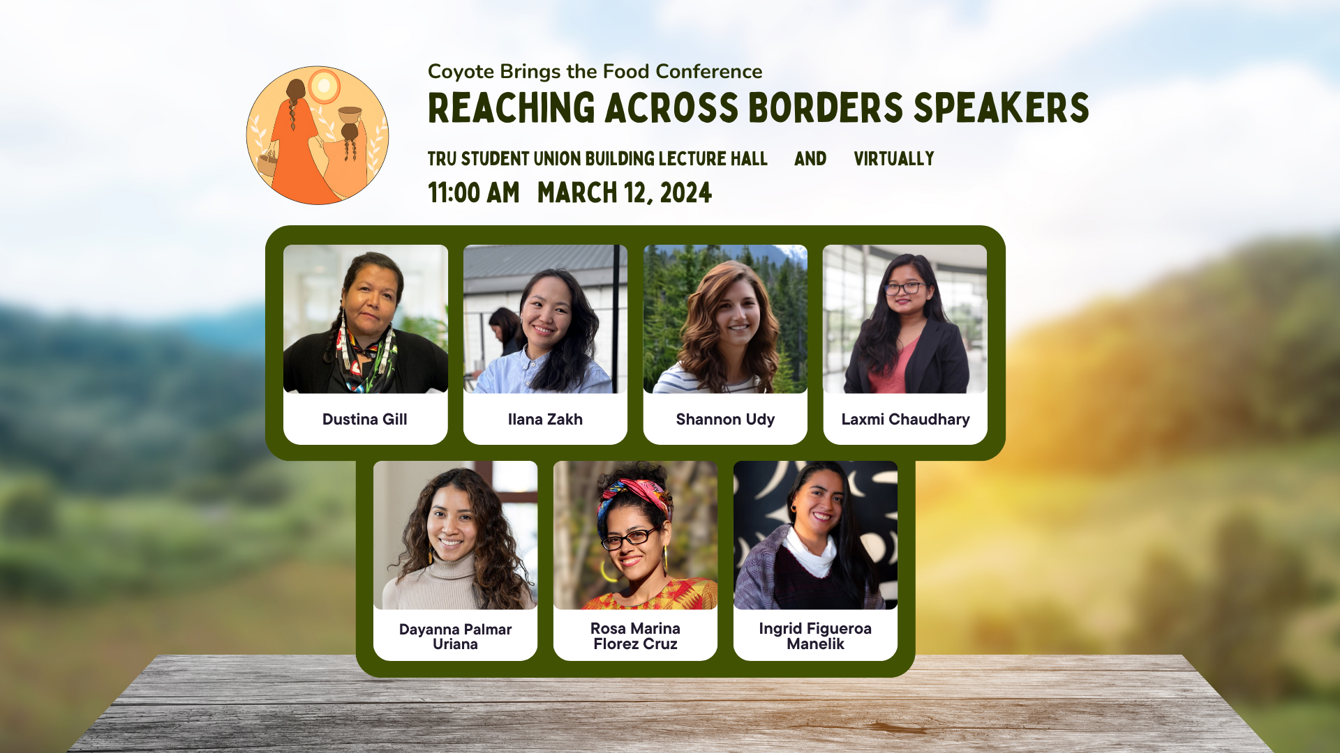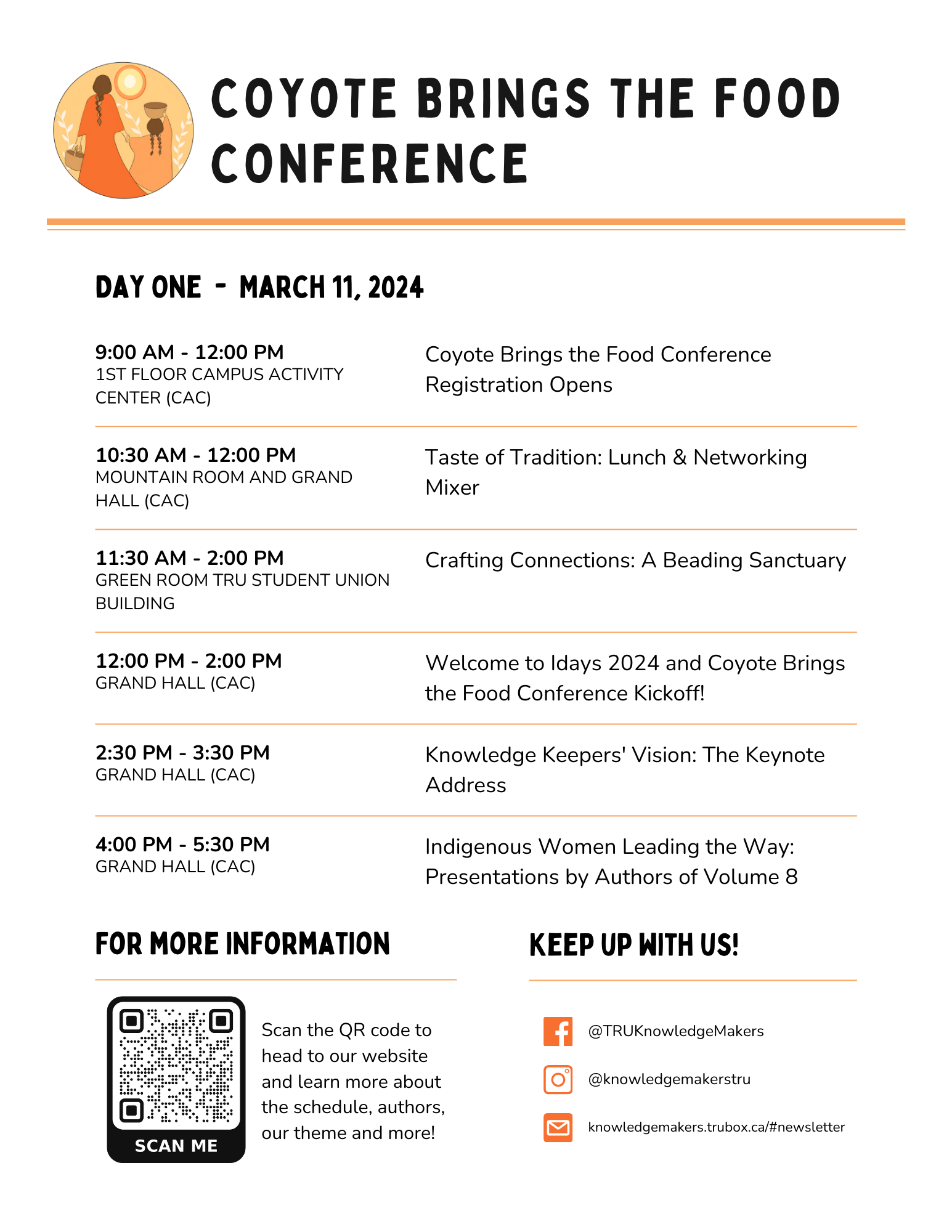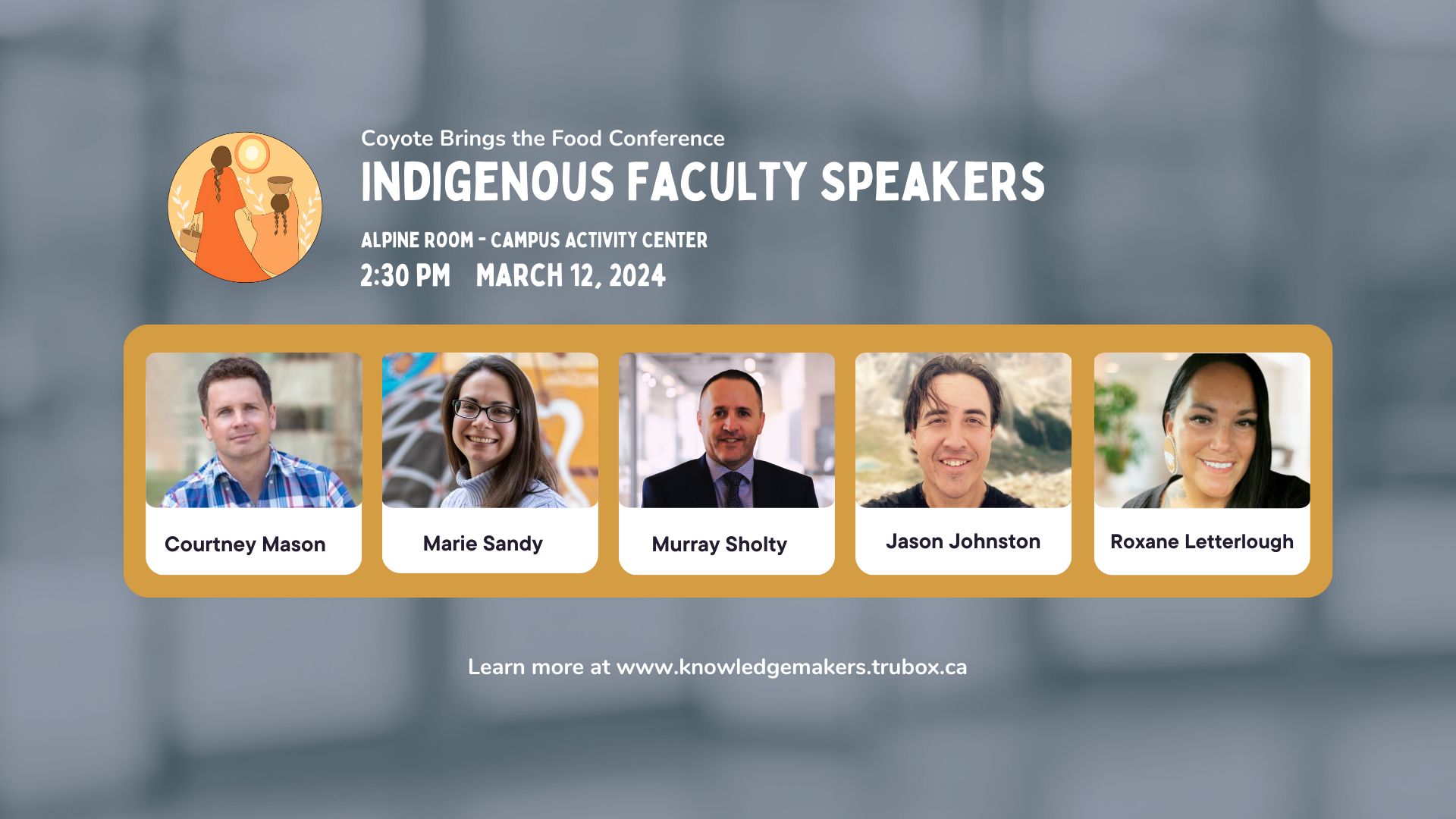 TV images were used on conference center and TRU campus screens, including a the image titled “Main Coyote Brings the Food” on CFJC Midday, after approvals from the Food and Agriculture Organization of the United Nations, TRU MARCOM, TRU World, and the All My Relations Indigenous Research Center.